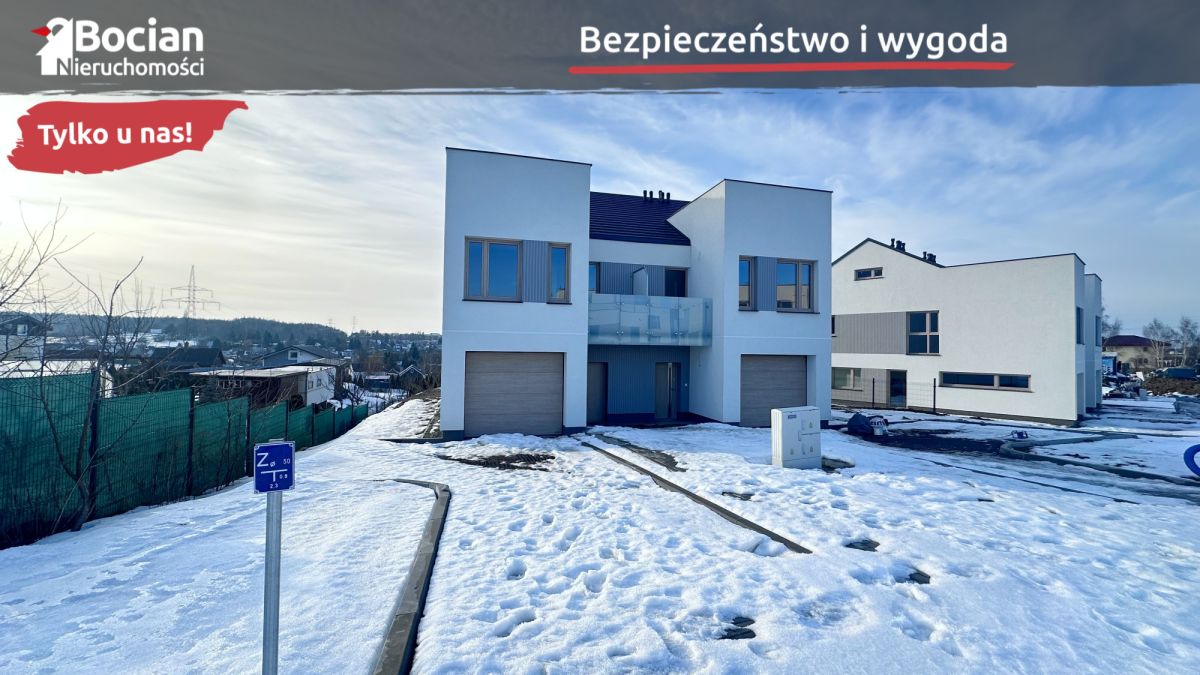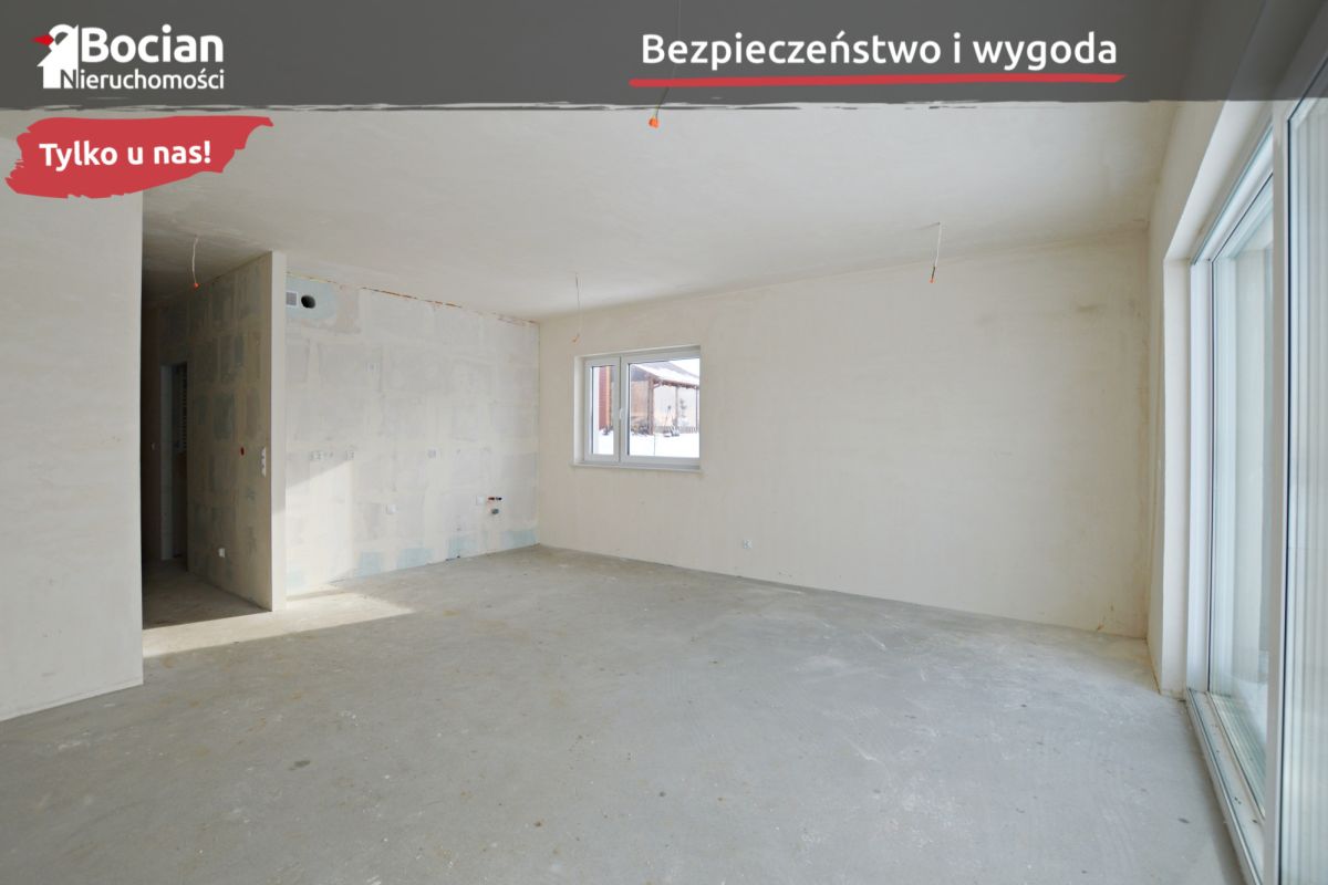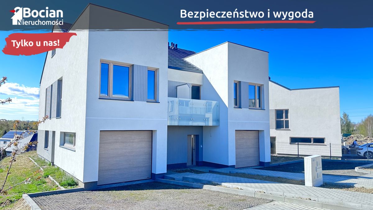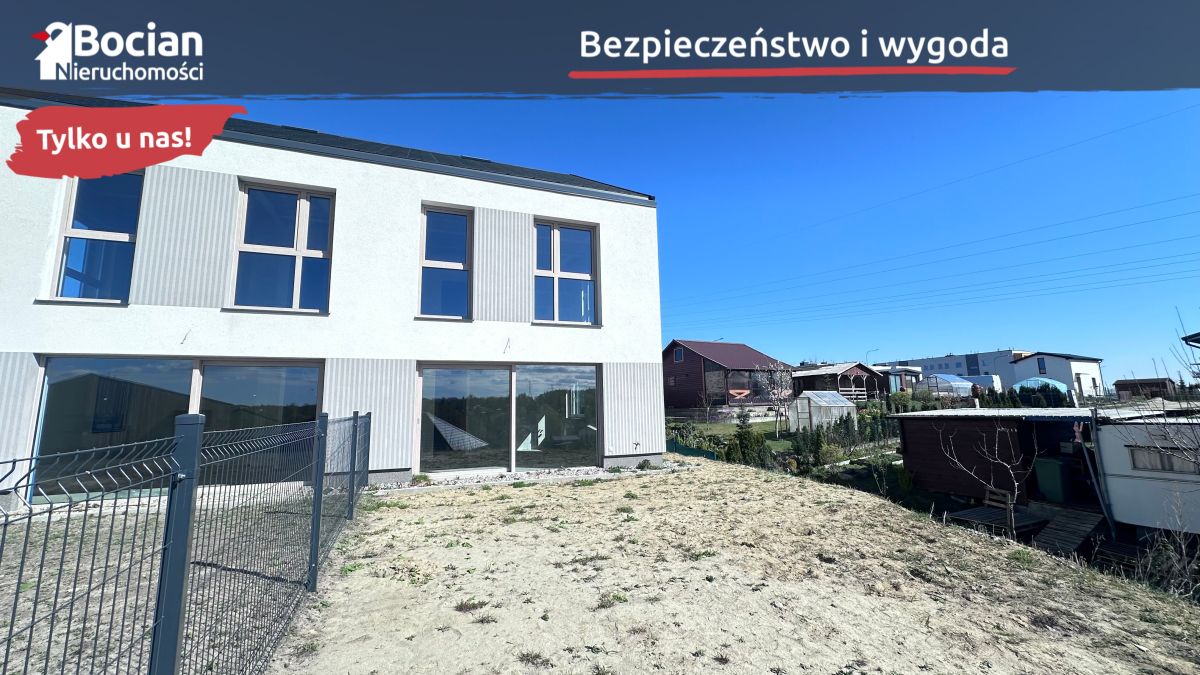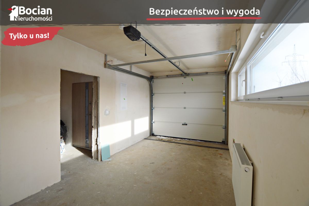 Dom posadowiony został na działce o powierzchni 460m2. Teren ogrodzony, ogrodzeniem panelowym. Taki metraż spokojnie pomieści część rekreacyjną, ogród oraz miejsce na różne pasje. Przed budynkiem został wyłożony szeroki podjazd z kostki brukowej oraz dodatkowe miejsce parkingowe.
