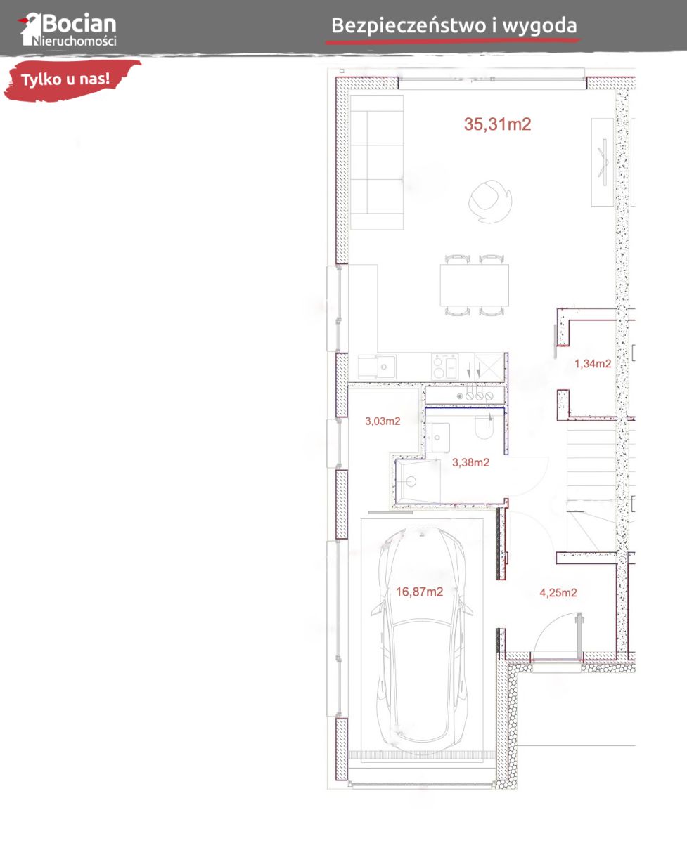 PARTER: salon z otwartą kuchnią , łazienka, korytarz, kotłownia, garaż, schowek
