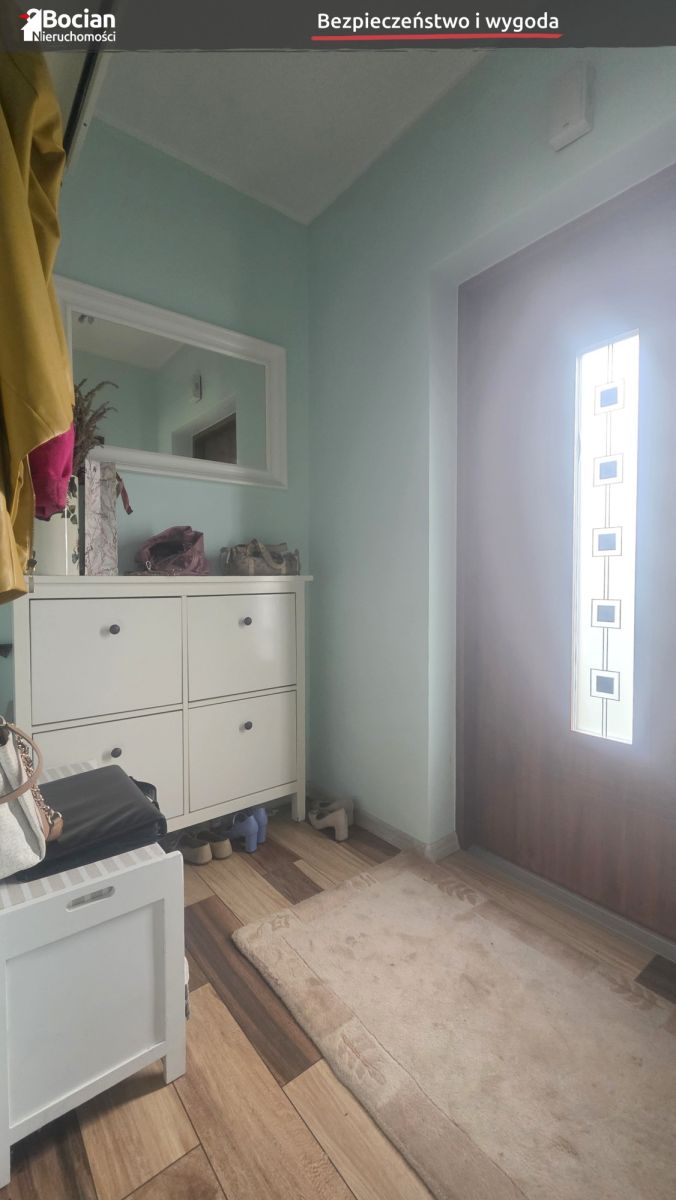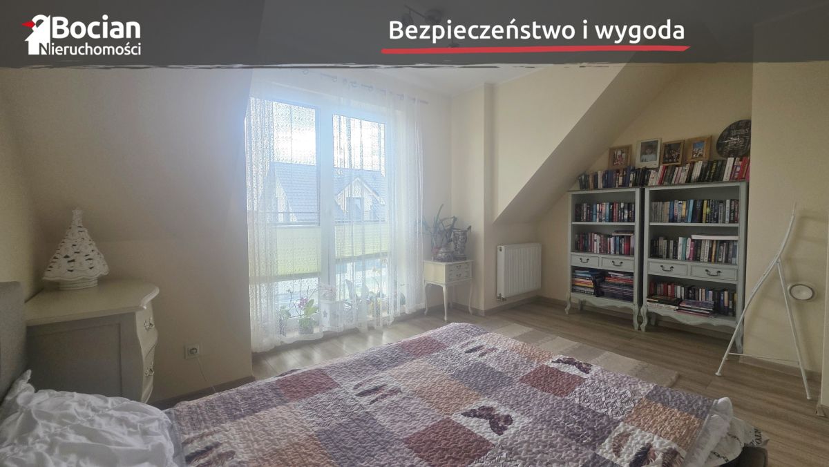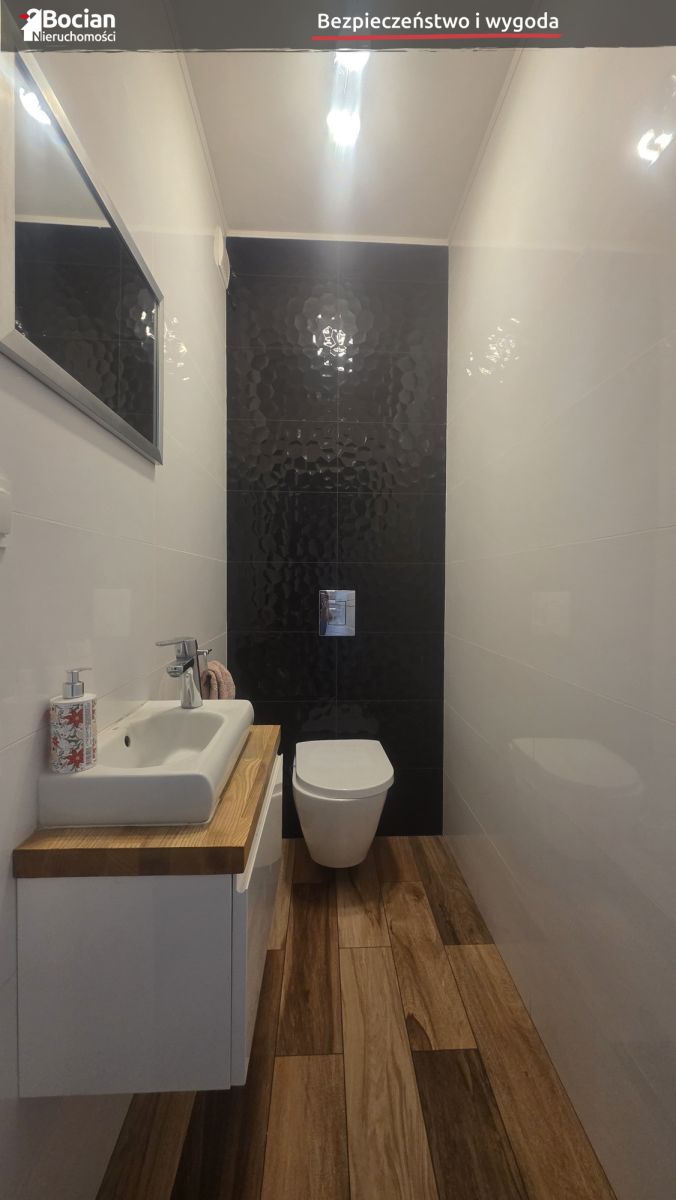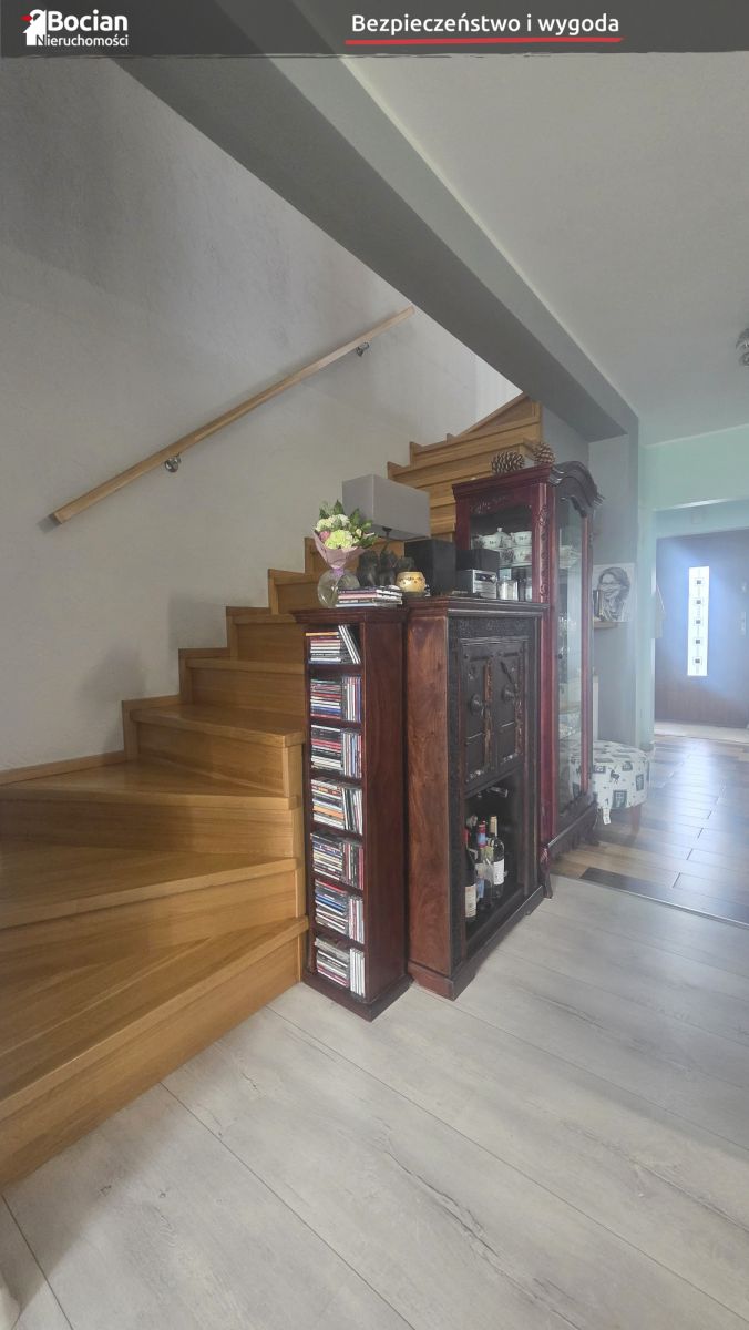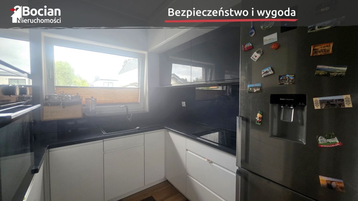 Dom urządzony jest według indywidualnego projektu, który jest niezwykle praktyczny a zarazem stylowy. Wszystkie pomieszczenia zostały wykończone z dbałością o szczegół. Świetnym przykładem są takie rozwiązania jak granitowe blaty i parapety, dębowe schody czy nowoczesne markizy (górna i boczna elektryczna) na tarasie, które idealnie powiększają część dzienną salonu o taras. Ta nieruchomość to nie tylko efekty wizualne i estetyczne, ale także bardzo przemyślana funkcjonalność, o której świadczą chociażby pojemne zabudowy w wielu miejscach. Kuchnia została zrobiona na wymiar według specjalnego projektu oraz wyposażona wysokiej klasy sprzętem AGD.
