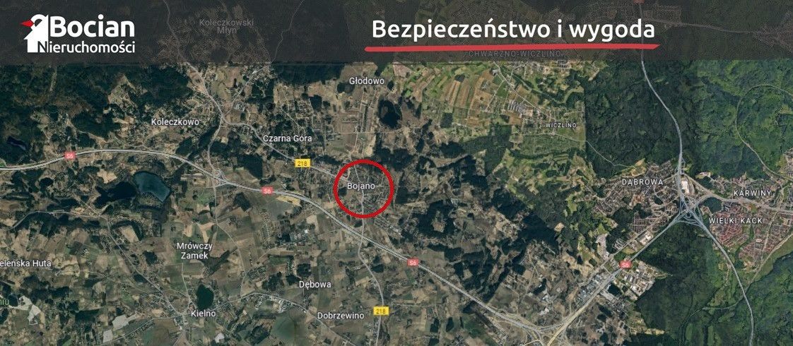 Nieruchomość położona jest w miejscowości Bojano. W pobliżu znajduje dobrze rozwinięta infrastruktura handlowo - usługowa m.in. klinika weterynaryjna, przedszkole, szkoła podstawowa, supermarket. Dodatkowym atutem jest szeroki dostęp do komunikacji publicznej co ułatwi przejazd osobom niezmotoryzowanym. Bojano jest bardzo dobrze skomunikowane z Gdańskiem i Gdynią. W okolicy znajdują się lasy, to idealnie miejsce dla spacerów oraz wycieczek rowerowych - gdzie można się w spokoju wyciszyć.