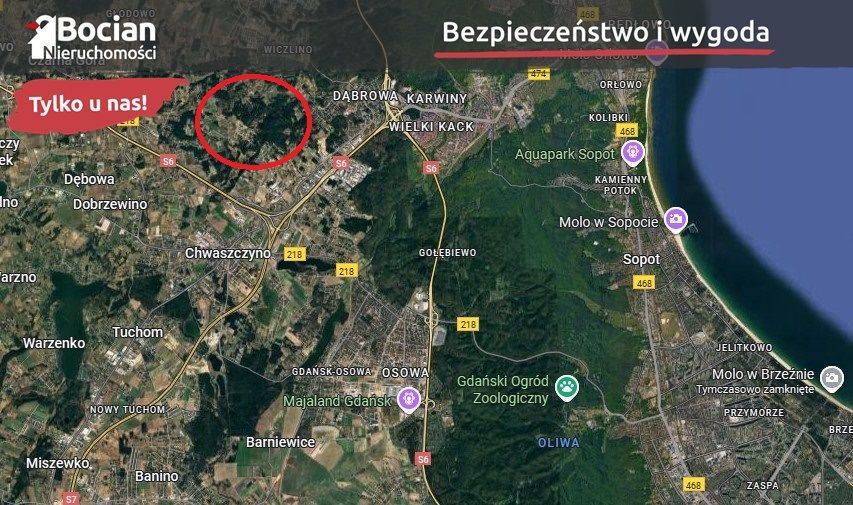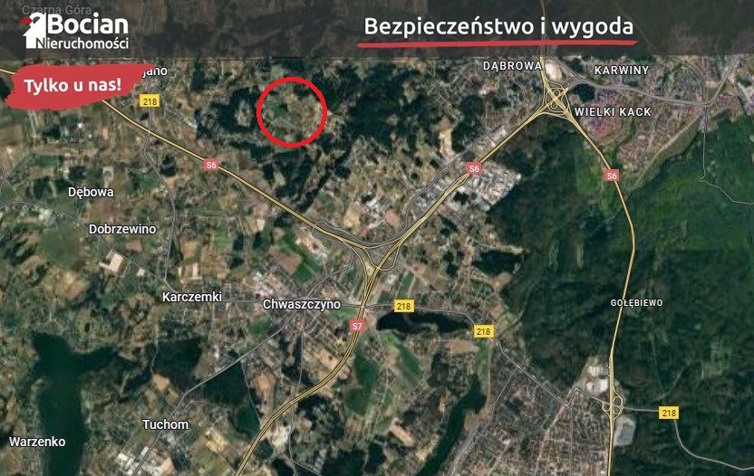 Chwaszczyno to doskonała lokalizacja dla osób ceniących ciszę i spokój, a jednocześnie wygodne połączenie z centrum Trójmiasta. Bliskość obwodnicy sprawia, że szybko dotrzemy do Gdańska, Sopotu czy Gdyni, a osoby bez samochodu z pewnością docenią dogodny dostęp do komunikacji miejskiej. Mieszkańcy mają tu do dyspozycji pełną infrastrukturę - szkołę, przedszkole, centrum handlowe, sklepy, kościół, a także usługi takie jak fryzjer czy kosmetyczka. To miejsce łączy w sobie uroki spokojnej okolicy z komfortem życia codziennego, a liczne tereny zielone znajdują się tuż obok.
