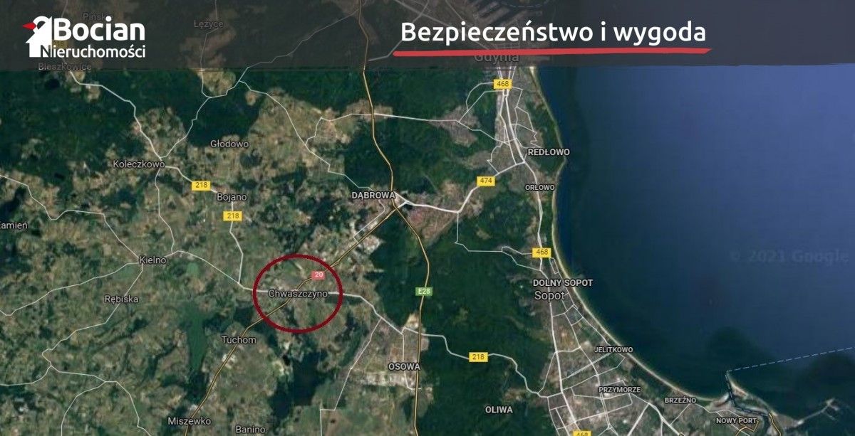 Chwaszczyno to idealne miejsce dla osób chcących odpocząć od codziennego zgiełku, ale jednocześnie ceniących sobie dobrą komunikację z Trójmiastem. Bliskość obwodnicy trójmiasta, a także budowanej trasy kaszubskiej zapewnią sprawny dojazd. Świetnie rozwinięta infrastruktura handlowo-usługowa zapewnia mieszkańcom m.in.: szkołę, supermarkety, kościół oraz inne usługi. Okolica nieruchomości otoczona jest lasami, a w odległości kilku metrów znajduje się jezioro Wysockie, idealne do spacerów, wypadów rowerowych i odpoczynku wśród natury.