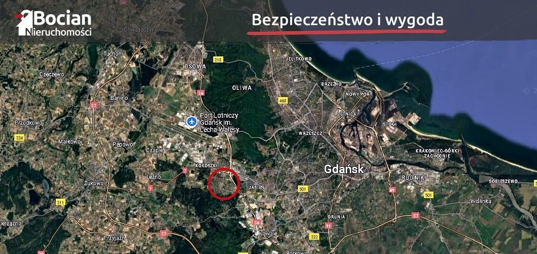 Nieruchomość położona jest w dobrze skomunikowanej dzielnicy - Gdańsk Kiełpino Górne. Osoby zmotoryzowane ucieszy fakt znajdującej się w bliskiej odległości obwodnicy, gdyż w szybkim tempie możemy poruszać się po całym Trójmieście. W zasięgu kilku minut od działki znajduje się pełna infrastruktura handlowo-usługowa: liczne sklepy, markety, szkoły, ośrodki zdrowia, lokale gastronomiczne. Sporą zaletą są również liczne tereny rekreacyjne oraz zielone, dzięki czemu nie jest odczuwalny zgiełk wielkiego miasta.