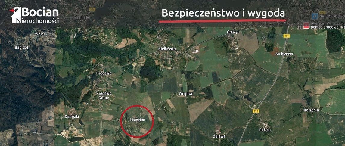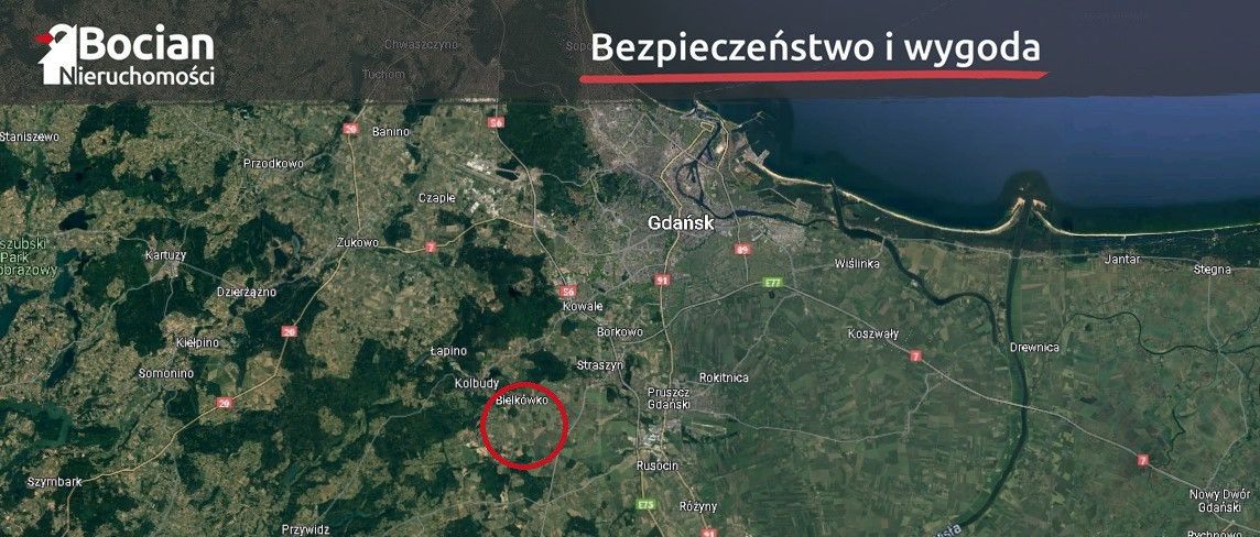 Działka znajduje się w miejscowości Lisewiec - tuż obok Bielkówka. Bielkówko posiada rewelacyjną komunikację zarówno z Gdańskiem, jak i całym Trójmiastem. Znajdziemy tu mnóstwo terenów spacerowych i zielonych, które zapewniają dużo możliwości spędzenia czasu wolnego. Niedaleko znajdują się punkty użyteczności publicznej takie jak: przedszkole, szkoła podstawowa, żłobek, sklep spożywczy oraz kościół.