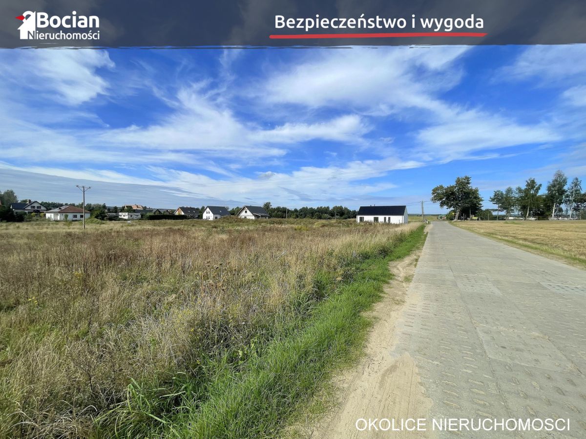 Płaska działka o powierzchni 1203m2, położonajest na nowopowstającym osiedlu domów jednorodzinnych. Dojazd do działki drogą gminną, wyłożoną płytami jumbo. Media: skrzynka z prądem, woda i kanalizacja znajdują na działce.