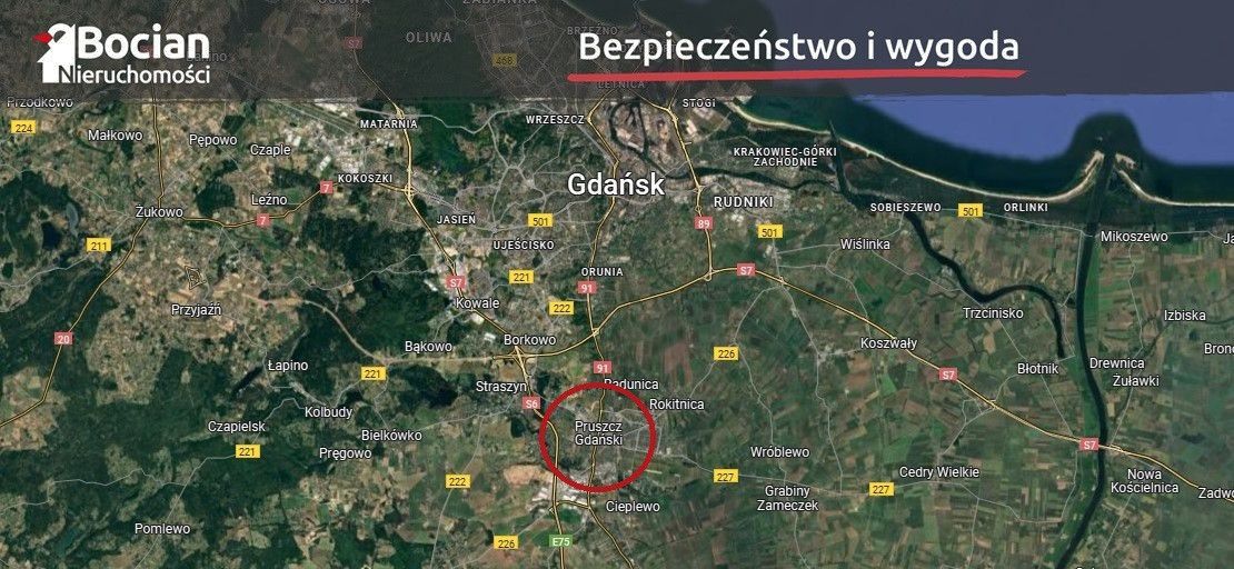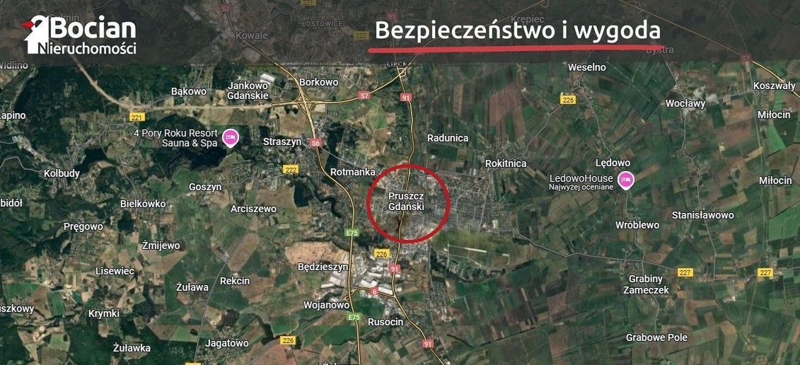 Działka położona w samym centrum Pruszcza Gdańskiego. W bliskim sąsiedztwie znajduje się pełna infrastruktura usługowo-handlowa zapewniająca rozrywkę i wygodę w codziennych obowiązkach oraz tereny zielone sprzyjające spacerom. Na wyciągnięcie ręki znajdują się sklepy, szkoły, przedszkola i restauracje. Blisko przystanki komunikacji miejskiej umożliwiające szybki dojazd do Trójmiasta.