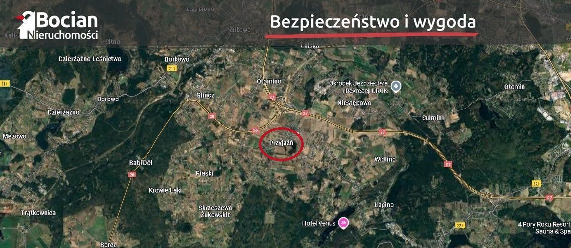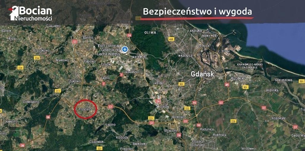 Działka położona jest w bardzo urokliwej miejscowości Przyjaźń. Lokalizacja ta zapewnia świetną komunikację z Trójmiastem. W niedalekiej przyszłości możliwość szybkiej komunikacji z Trójmiastem, dzięki powstającej obwodnicy. Dla osób niezmotoryzowanych zaletą będzie z kolei komunikacja publiczna. W miejscowości znajduje się infrastruktura handlowo-usługowa m.in. placówki oświatowe, kościół, sklepy, restauracja oraz lokale usługowe. Jednak największym atutem tej lokalizacji jest bliskość i otoczenie natury, które pozwala odpocząć i zrelaksować się po ciężkim dniu pracy.