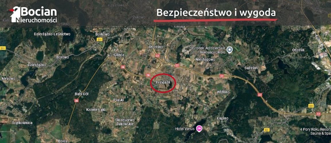 Działki położone są w Przyjaźni, która położona jest w otulinie kolorowych lasów, jezior oraz łąk. Tak bajeczne miejsce na pewno pozwoli na odpoczynek po ciężkim dniu w pracy, jak również zapewni wiele możliwości spędzenia czasu wolnego w weekendy. Jednak największym atutem Przyjaźni jest położenie na obrzeżach Trójmiasta, dzięki czemu można korzystać ze wszystkich dogodności jakie posiada duża aglomeracja, spełniać się aktywnie zawodowo, a tym samym po pracy czuć się jak na wakacjach. W niedalekim sąsiedztwie znajdziemy również mniejsze miasta takie jak Żukowo czy Kolbudy, gdzie mamy pełne zaplecze handlowo-usługowe. W samej zaś Przyjaźni znajdziemy wszystko co niezbędne do wygodnego życia czyli szkołę, przedszkole, kościół, sklepy spożywcze i inne. Dla osób zmotoryzowanych jest to idealne miejsce ze względu na bardzo szybki dojazd do Gdańska jak i Gdyni zajmie on około 20 minut drogi.