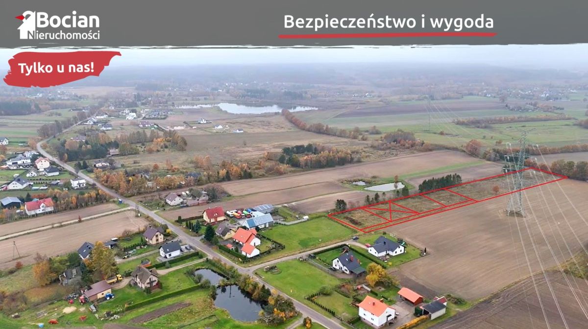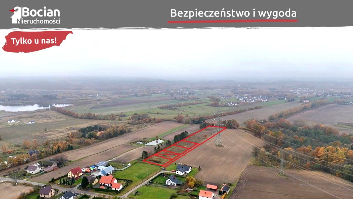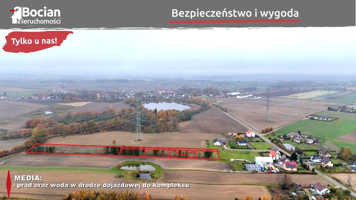 Kompleks położony jest na nowopowstającym osiedlu domów jednorodzinnych. Kameralna zabudowa oraz położenie przy krótkiej ślepej uliczce, zapewniają dobre sąsiedztwo, ciszę i spokój. Powierzchnia działek wynosi od 998m2 do 5830m2. Teren działek jest płaski, nieogrodzony oraz bardzo dobrze nasłoneczniony. Wjazd na działki jest od strony północnej, dzięki czemu jej przyszła zabudowa będzie miała najlepszą z możliwych ekspozycji względem stron świata - mianowicie część dzienna domu oraz ogród będą wychodziły na stronę południową. Dojazd do działek drogą gruntową utwardzoną. Jest to droga prywatna, w której udział wliczony jest w cenę nieruchomości. Media: prąd oraz woda oddalone o ok. 30m od granicy kompleksu.