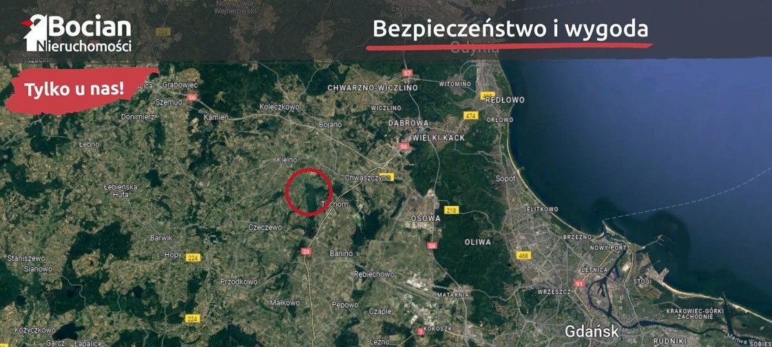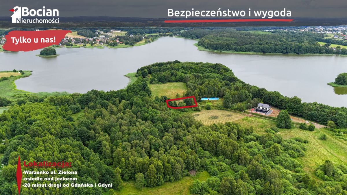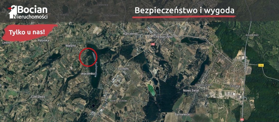 Nieruchomość położona jest w miejscowości Warzenko. Położenie miejscowości na obrzeżach Trójmiasta to najlepszy wybór dla osób ceniących sobie ciszę i spokój, a jednocześnie chcących pozostać blisko wielkiego miasta. Ogromną zaletą tego miejsca są piękne lasy, do których możemy udać się na popołudniowy spacer albo pojeździć rowerem. Również Jezioro Tuchomskie jest ogromnym plusem tego miejsca.