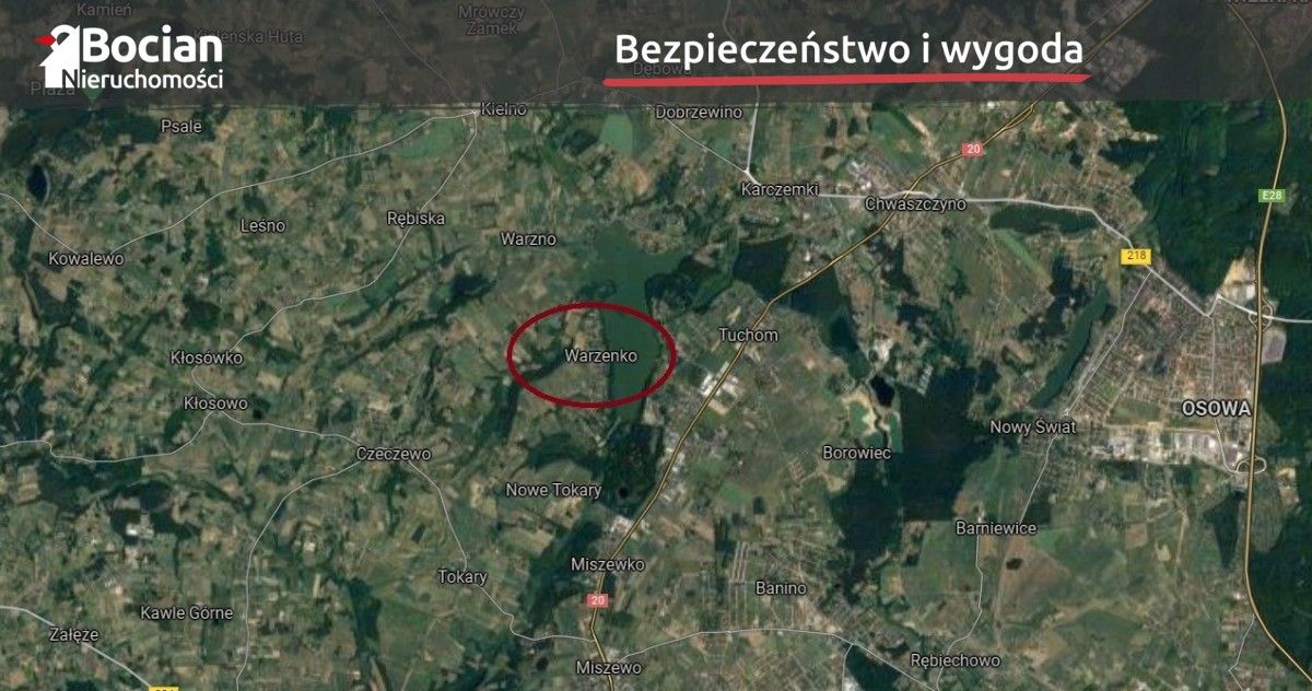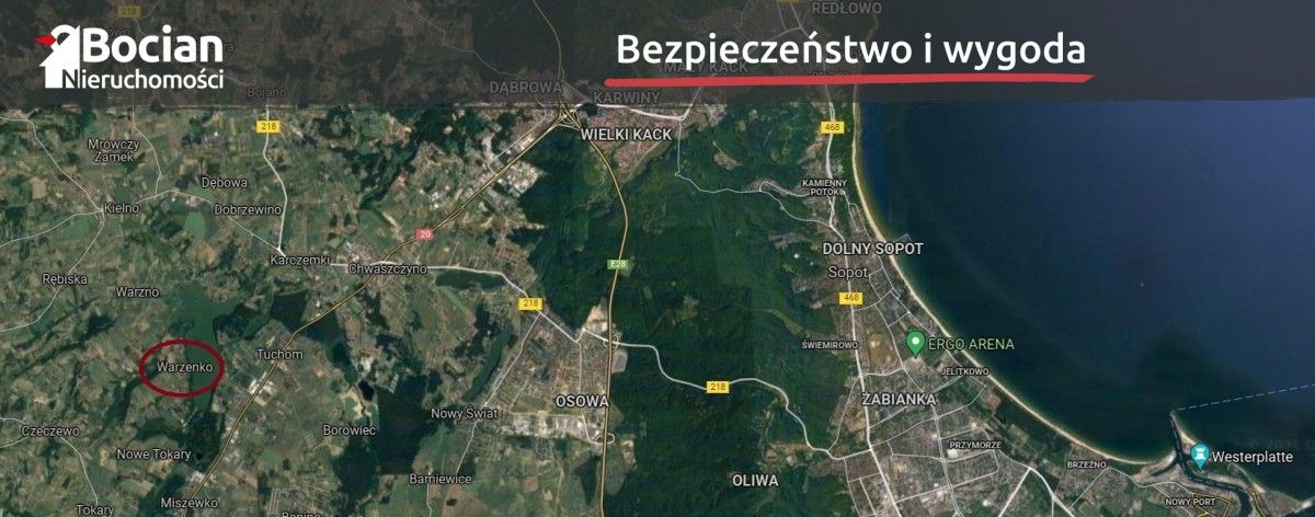 Nieruchomość położona jest w miejscowości Warzenko. Położenie miejscowości na obrzeżach Trójmiasta to najlepszy wybór dla osób ceniących sobie ciszę i spokój, a jednocześnie chcących pozostać blisko wielkiego miasta. Ogromną zaletą tego miejsca są piękne lasy, do których możemy udać się na popołudniowy spacer albo pojeździć rowerem. Również Jezioro Tuchomskie jest ogromnym plusem tego miejsca.