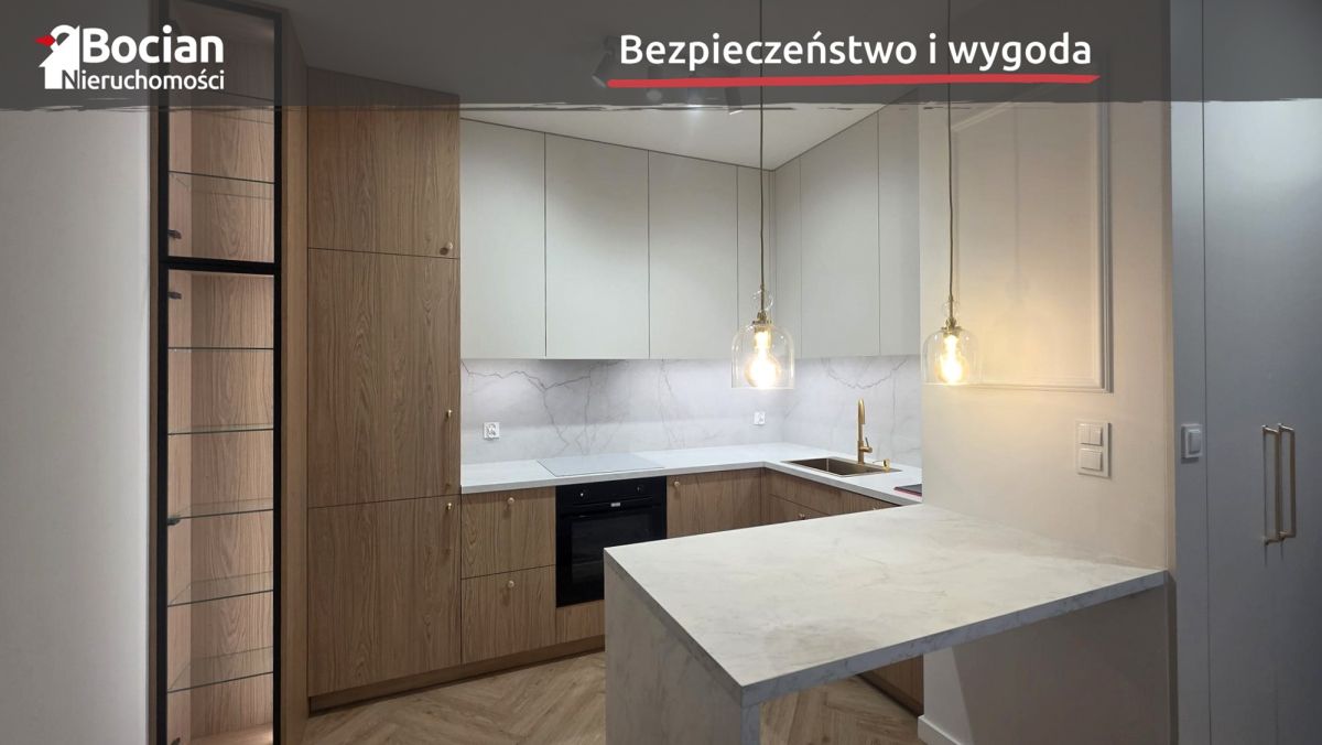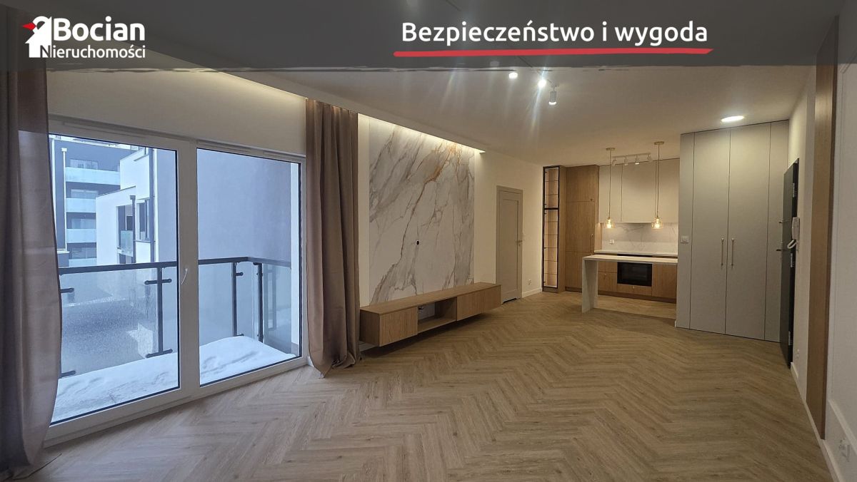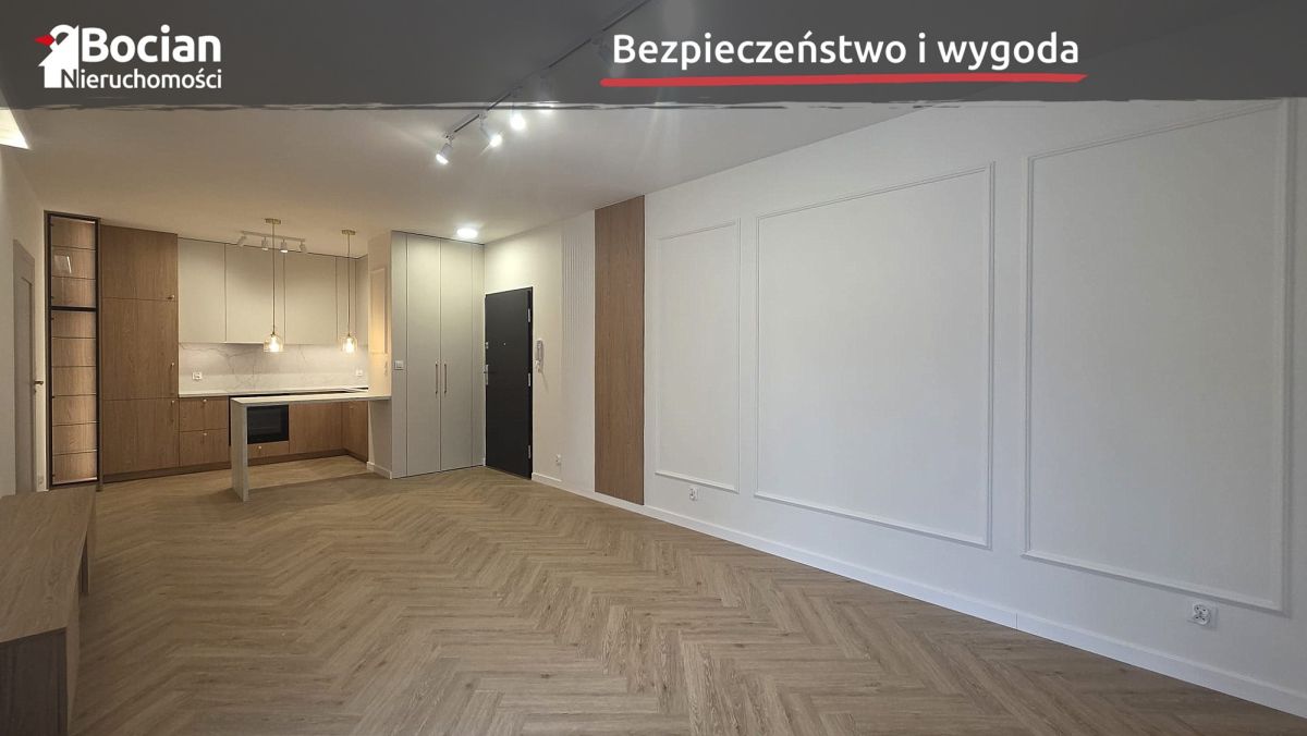 Powierzchnia lokalu wynosi 38m2. Skała się na nią przestronny pokój, kuchnia otwarta i łazienka. Powierzchnia pokoju pozwala na wydzielenie strefy dziennej oraz odpoczynku. Mieszkanie jest wykończone w wysokim standardzie. Na podłogach znajdują się dobrej klasy panele winylowe. Zabudowa kuchenna oraz meble łazienkowe wykonane na wymiar przez stolarza. W zabudowie mamy również pojemną szafę przy wejściu.