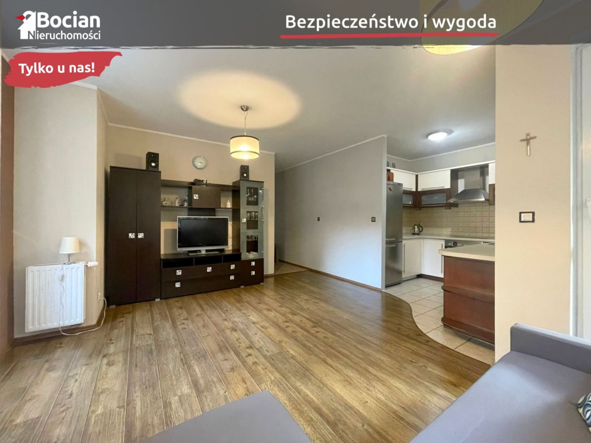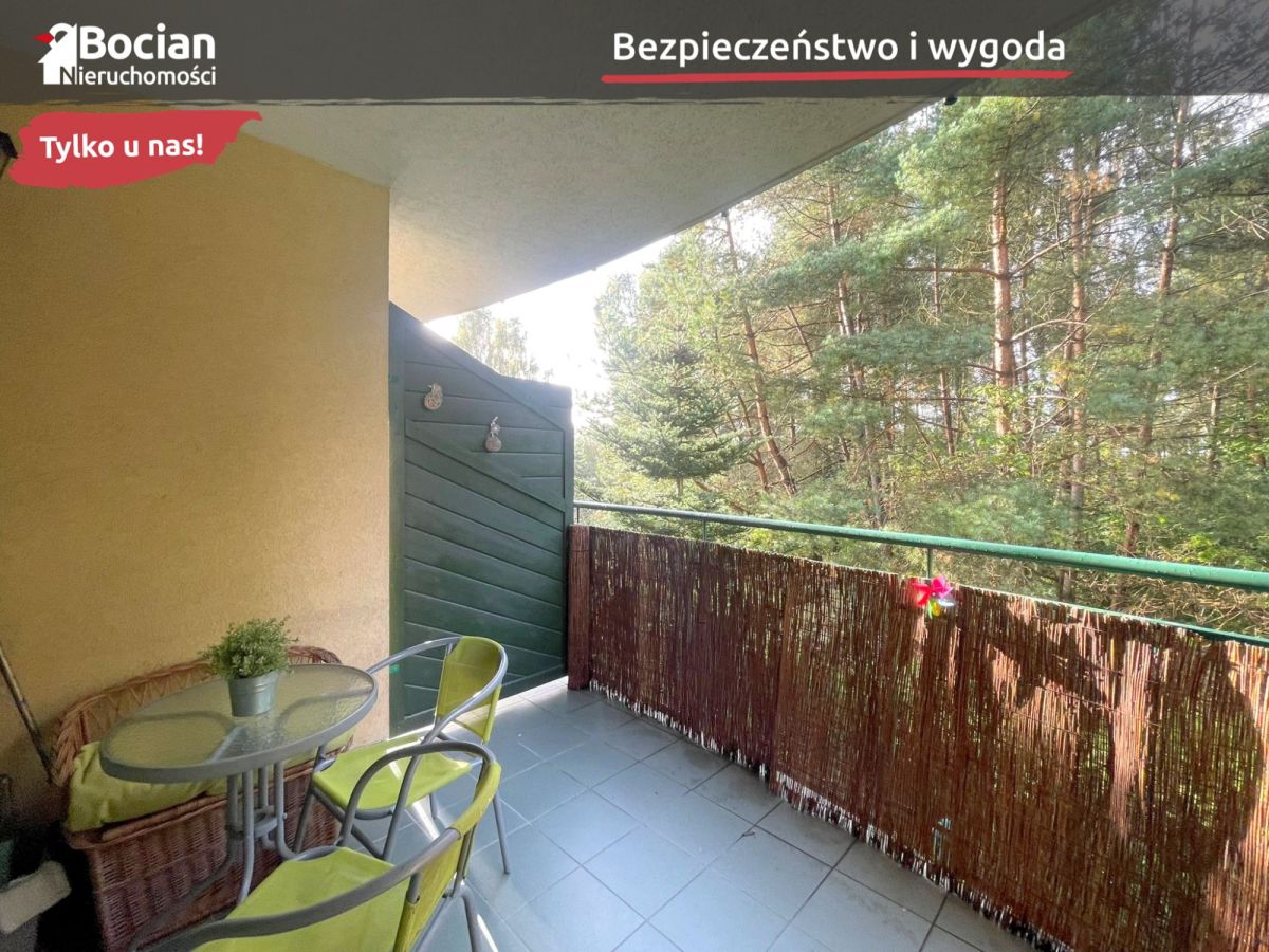 Mieszkanie o powierzchni 49,4m2 składa się z salonu z aneksem kuchennym, sypialni, łazienki i korytarza. Mieszkanie ma funkcjonalny układ, a pomieszczenia są przestronne i dobrze nasłonecznione. Kuchnia została wykonana w zabudowie, z pełnym wyposażeniem AGD. W korytarzu znajduje się pojemna szafa również wykonana na wymiar. Nieruchomość posiada również zadaszony balkon z widokiem na las.