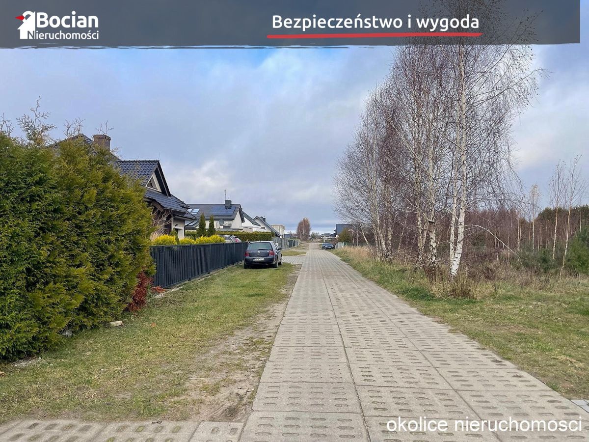 Działka o powierzchni 1175m2 położona jest w nowo budującej się części miejscowości. Po sąsiedzku jedynie niska zabudowa jednorodzinna. Jest to teren płaski, nieogrodzony i świetnie nasłoneczniony. Media: skrzynka z prądem oraz woda na granicy działki. Droga dojazdowa nabywana jest w udziałach, utwardzona żwirem.