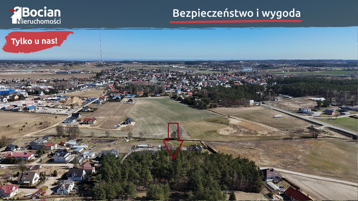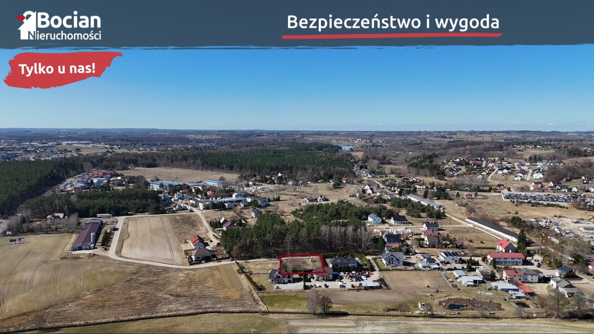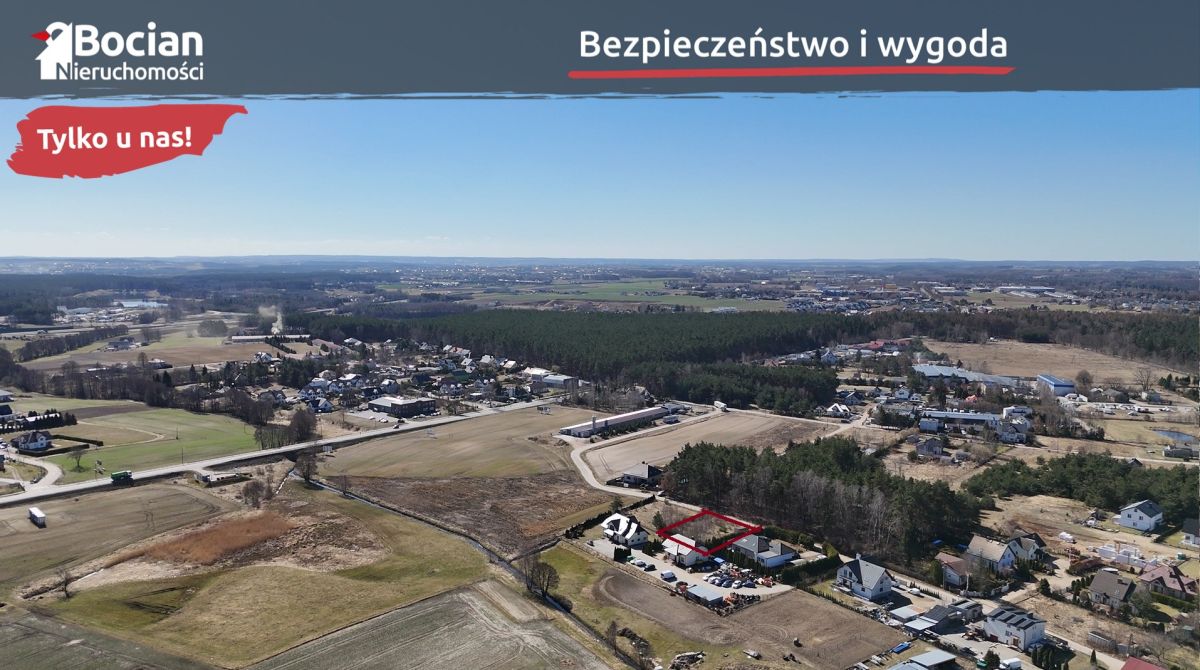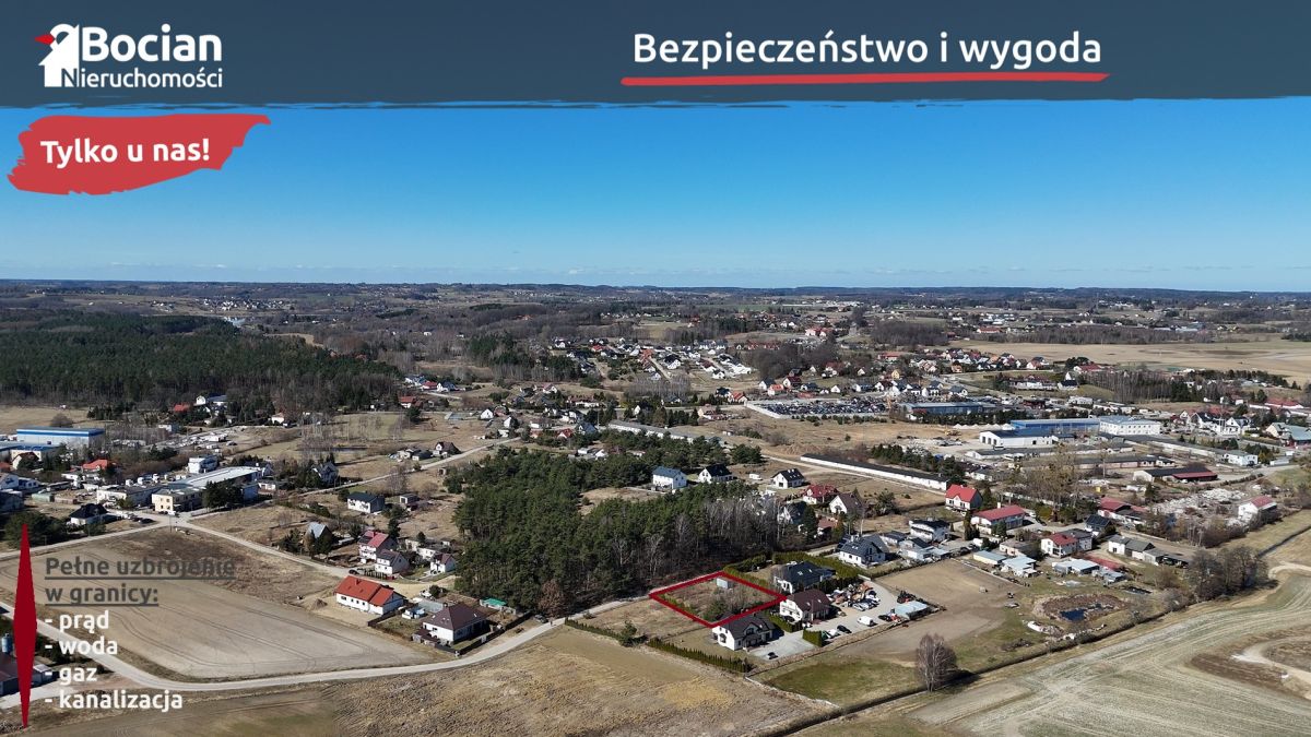 Działka o powierzchni 999 m2 znajduje się na nowopowstającym osiedlu domów jednorodzinnych pod lasem. Teren działki jest płaski i w pełni ogrodzony. Od frontu znajduje się brama wjazdowa. Dojazd do nieruchomości drogą gminną - płytami jumbo. Media: prąd, gaz, woda oraz kanalizacja znajdują się na granicy działki.