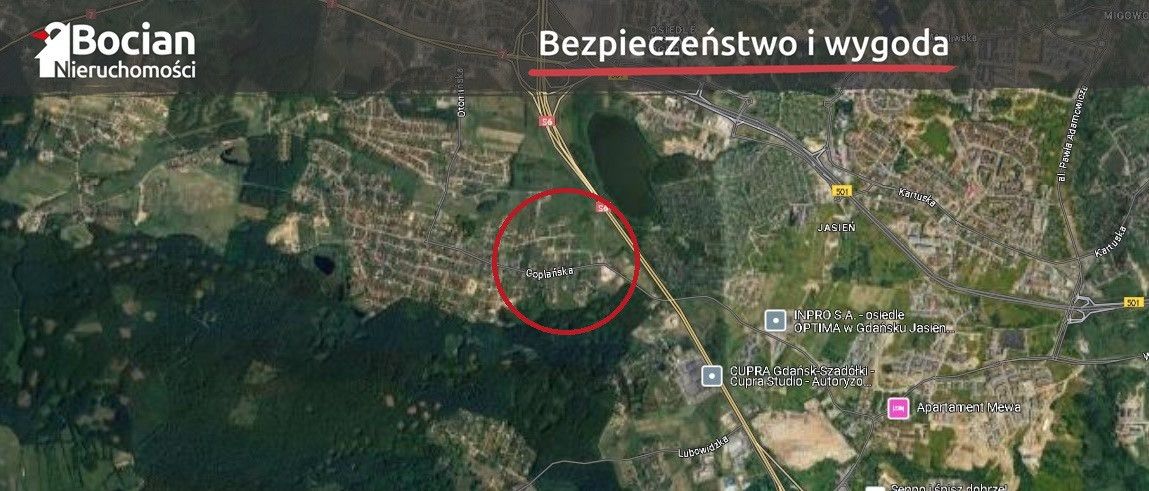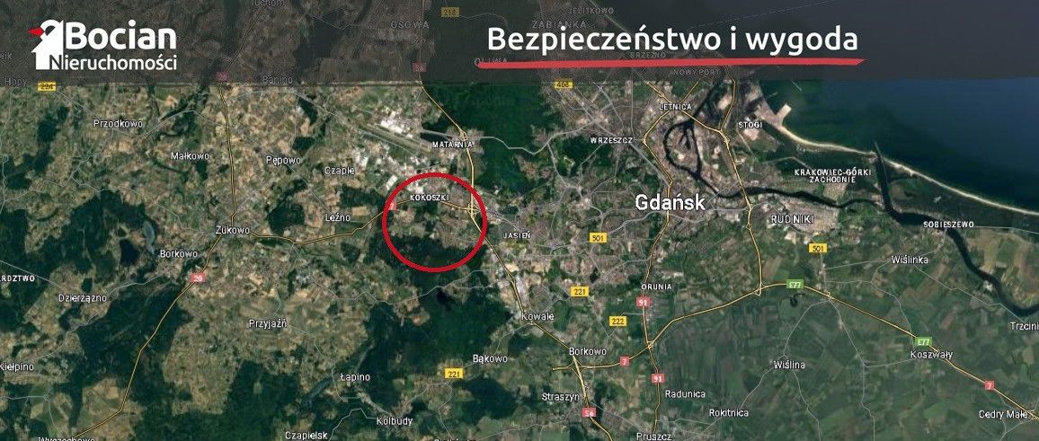 Nieruchomość położona jest w dobrze skomunikowanej dzielnicy - Gdańsk Kiełpino Górne. Osoby zmotoryzowane ucieszy fakt znajdującej się w bliskiej odległości obwodnicy, gdyż w szybkim tempie możemy poruszać się po całym Trójmieście. W zasięgu kilku minut od działki znajduje się pełna infrastruktura handlowo-usługowa: liczne sklepy, markety, szkoły, ośrodki zdrowia, lokale gastronomiczne. Sporą zaletą są również liczne tereny rekreacyjne oraz zielone, dzięki czemu nie jest odczuwalny zgiełk wielkiego miasta.
