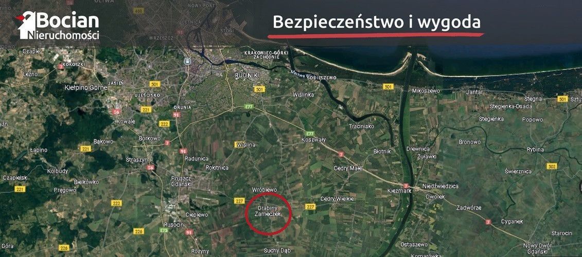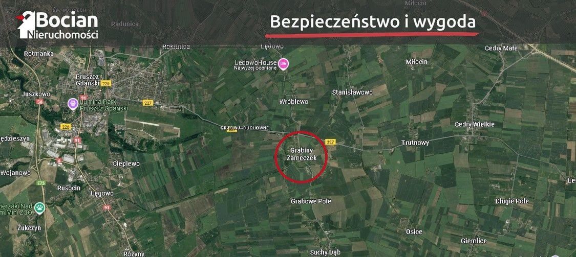Nieruchomość jest położona w miejscowości Grabiny-Zameczek. Znajduje się ona 10km od centrum Pruszcz Gdańskiego oraz bezpośrednio przy Suchym Dębie - miejscowości gminnej z dobrze rozwiniętą infrastrukturą usługowo-handlową m.in szkoła podstawowa, przychodnia, weterynarz, sklepy spożywcze. Dodatkowym atutami miejscowości jest jej bliskie położenie od Gdańska zapewniające tym samym idealne rozwiązanie dla osób chcących połączyć aktywne życie zawodowe z zacisznym odpoczynkiem. Miejscowość malowniczo położona w zakolu rzeki Motławy.