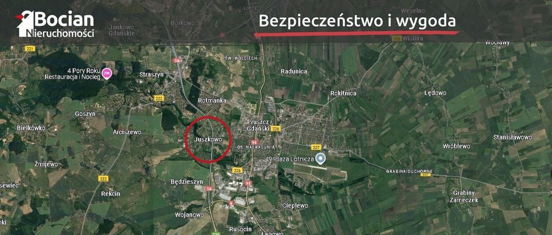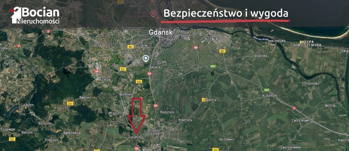 Nieruchomość położona jest w Juszkowie - prężnie rozwijającej się miejscowości przyklejona do Gdańska. Ta miejscowość to doskonałe miejsce komunikacyjne z Trójmiastem ze względu na łatwość dostępu do Obwodnicy Trójmiasta. Infrastruktura handlowo-usługowa jest tu bardzo dobrze rozwinięta m.in. liczne sklepy, szkoła, przedszkole, poczta, itp. Ogromną zaletą jest bliskość lasów oraz rzeki Raduni, które zapewniają idealną przestrzeń do spędzania czasu wolnego.